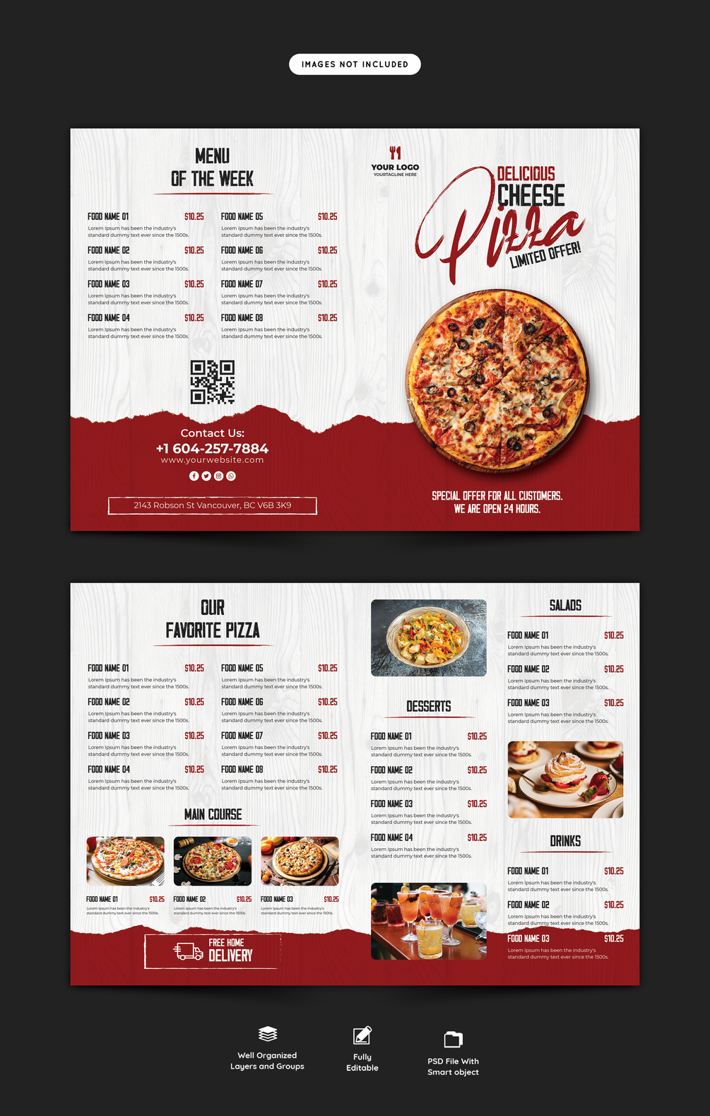 Design a stunning and professional restaurant menu with this fully editable PSD template. Easily customize text, colors, and images to match your brand. Ideal for restaurants, cafes, and food businesses looking to enhance their presentation and attract more customers. Download now and create a menu that stands out!